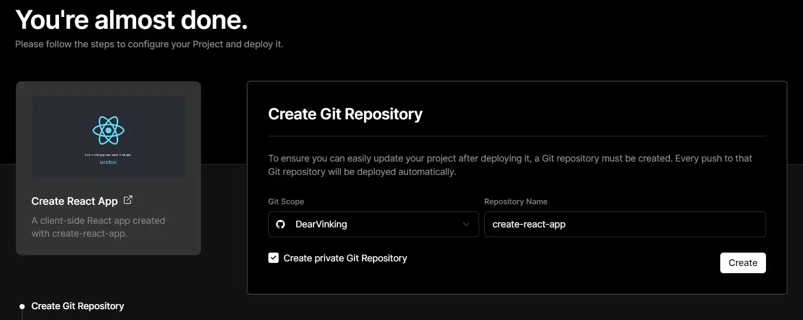 接着在 Create Git Repository 内点击 Github 连接你的 Github ,输入自定义仓库名字,默认勾选 Create private Git Repository 设置为私人仓库,点击 Create 即可自动部署。