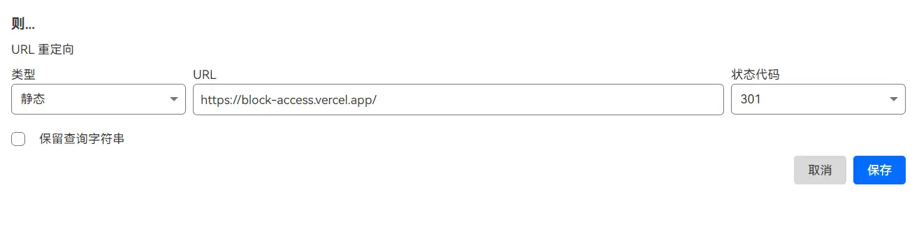 </html>回到 Cloudflare ,点击规则项的重定向规则,创建一条规则。将上面屏蔽营销蜘蛛的表达式填入表达式编辑框,类型选择静态、URL 填入刚才的 Vercel 托管页面的链接、状态代码设置为 301 、取消勾选保留查询字符串即可自定义的拦截网页。