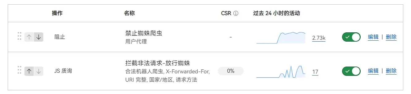 到此,如果宝塔的 Nginx 免费防火墙的风险拦截数字不再增加。而 Cloudflare 的防火墙规则拦截数疯狂增加的时候就证明已经从 Cloudflare 成功拦截到这些垃圾蜘蛛的访问了。