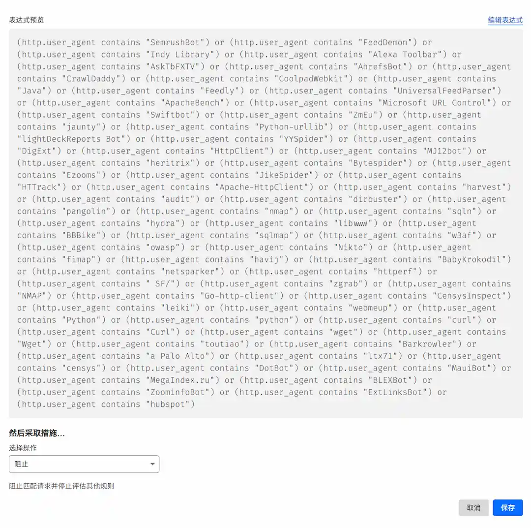 (http.user_agent contains "SemrushBot") or (http.user_agent contains "FeedDemon") or (http.user_agent contains "Indy Library") or (http.user_agent contains "Alexa Toolbar") or (http.user_agent contains "AskTbFXTV") or (http.user_agent contains "AhrefsBot") or (http.user_agent contains "CrawlDaddy") or (http.user_agent contains "CoolpadWebkit") or (http.user_agent contains "Java") or (http.user_agent contains "Feedly") or (http.user_agent contains "UniversalFeedParser") or (http.user_agent contains "ApacheBench") or (http.user_agent contains "Microsoft URL Control") or (http.user_agent contains "Swiftbot") or (http.user_agent contains "ZmEu") or (http.user_agent contains "jaunty") or (http.user_agent contains "Python-urllib") or (http.user_agent contains "lightDeckReports Bot") or (http.user_agent contains "YYSpider") or (http.user_agent contains "DigExt") or (http.user_agent contains "HttpClient") or (http.user_agent contains "MJ12bot") or (http.user_agent contains "heritrix") or (http.user_agent contains "Bytespider") or (http.user_agent contains "Ezooms") or (http.user_agent contains "JikeSpider") or (http.user_agent contains "HTTrack") or (http.user_agent contains "Apache-HttpClient") or (http.user_agent contains "harvest") or (http.user_agent contains "audit") or (http.user_agent contains "dirbuster") or (http.user_agent contains "pangolin") or (http.user_agent contains "nmap") or (http.user_agent contains "sqln") or (http.user_agent contains "hydra") or (http.user_agent contains "libwww") or (http.user_agent contains "BBBike") or (http.user_agent contains "sqlmap") or (http.user_agent contains "w3af") or (http.user_agent contains "owasp") or (http.user_agent contains "Nikto") or (http.user_agent contains "fimap") or (http.user_agent contains "havij") or (http.user_agent contains "BabyKrokodil") or (http.user_agent contains "netsparker") or (http.user_agent contains "httperf") or (http.user_agent contains " SF/") or (http.user_agent contains "zgrab") or (http.user_agent contains "NMAP") or (http.user_agent contains "Go-http-client") or (http.user_agent contains "CensysInspect") or (http.user_agent contains "leiki") or (http.user_agent contains "webmeup") or (http.user_agent contains "Python") or (http.user_agent contains "python") or (http.user_agent contains "wget") or (http.user_agent contains "Wget") or (http.user_agent contains "toutiao") or (http.user_agent contains "Barkrowler") or (http.user_agent contains "a Palo Alto") or (http.user_agent contains "ltx71") or (http.user_agent contains "censys") or (http.user_agent contains "DotBot") or (http.user_agent contains "MauiBot") or (http.user_agent contains "MegaIndex.ru") or (http.user_agent contains "BLEXBot") or (http.user_agent contains "ZoominfoBot") or (http.user_agent contains "ExtLinksBot") or (http.user_agent contains "hubspot") or (http.user_agent contains "okhttp")然后选择操作选择阻止后保存即可。